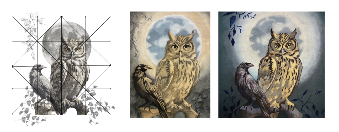 Final Composition: First layer: charcoal painting, 2nd layer: blue monochromatic under painting, and finished painting with a limited colored oil glazes.